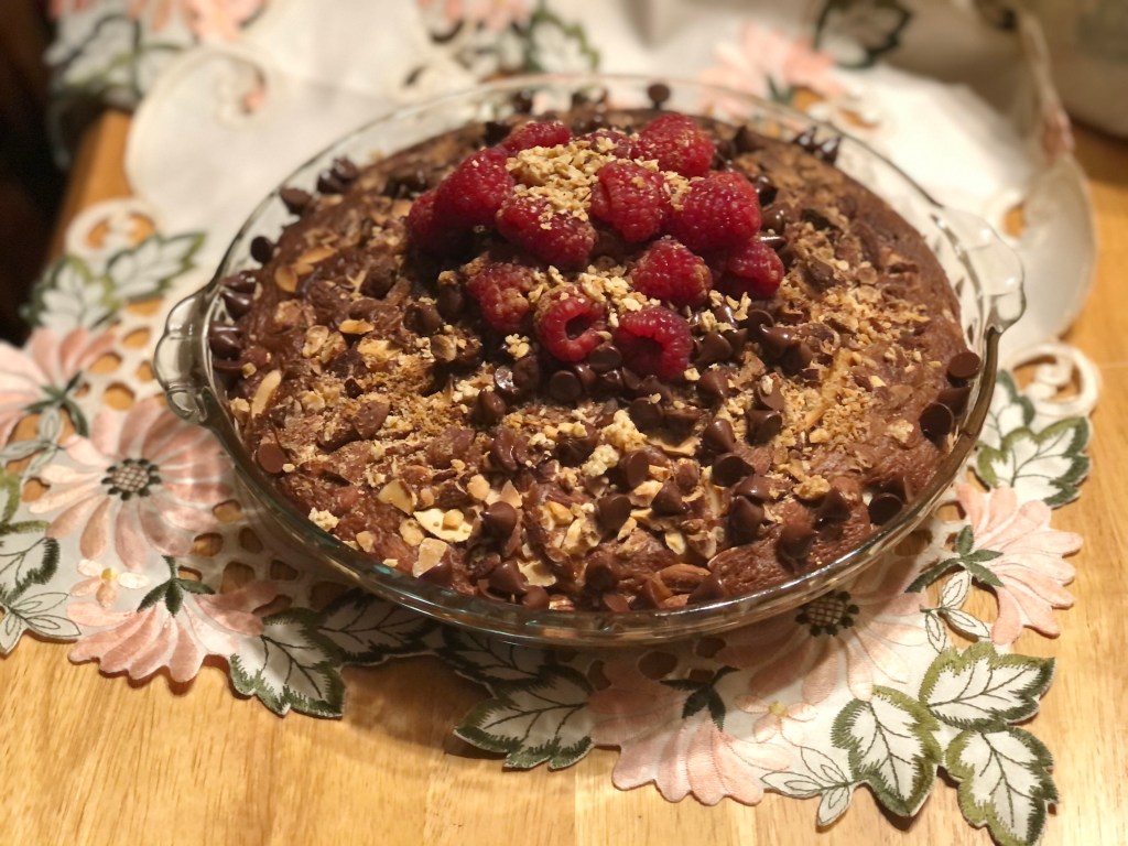 7. Once baked and cooled, spread the almonds on the cake, and drizzle the melted coconut chocolate over the almonds. Top it with berries, cinnamon apple, and/or granola. And voila, a culinary apprenticed cake!