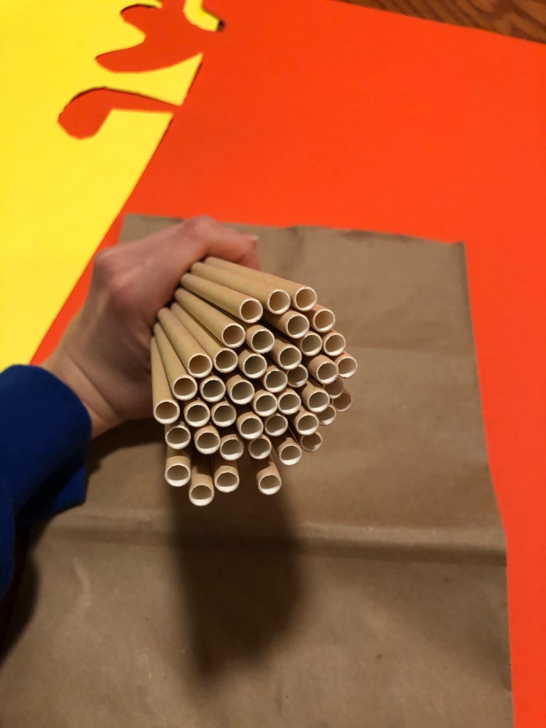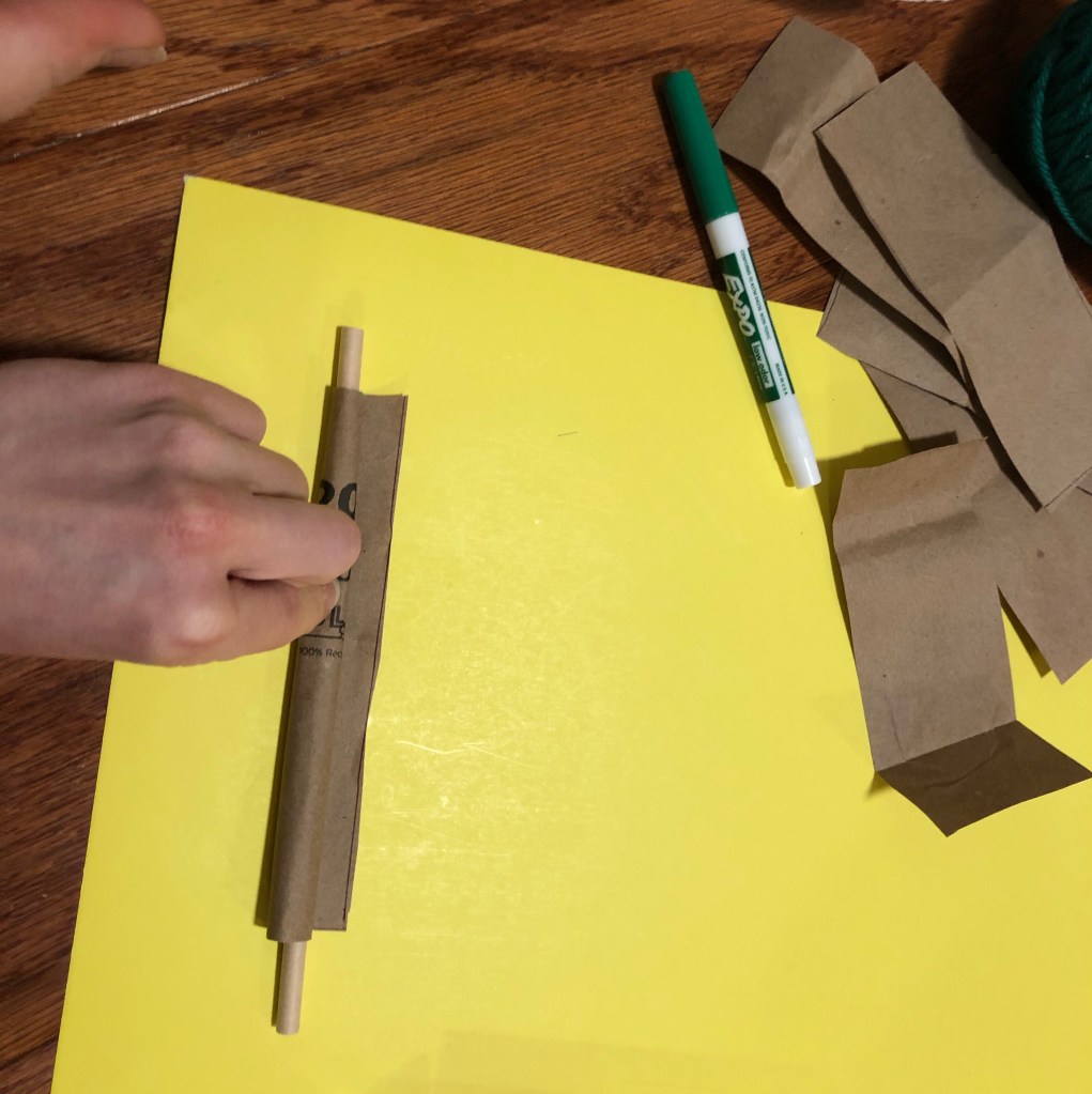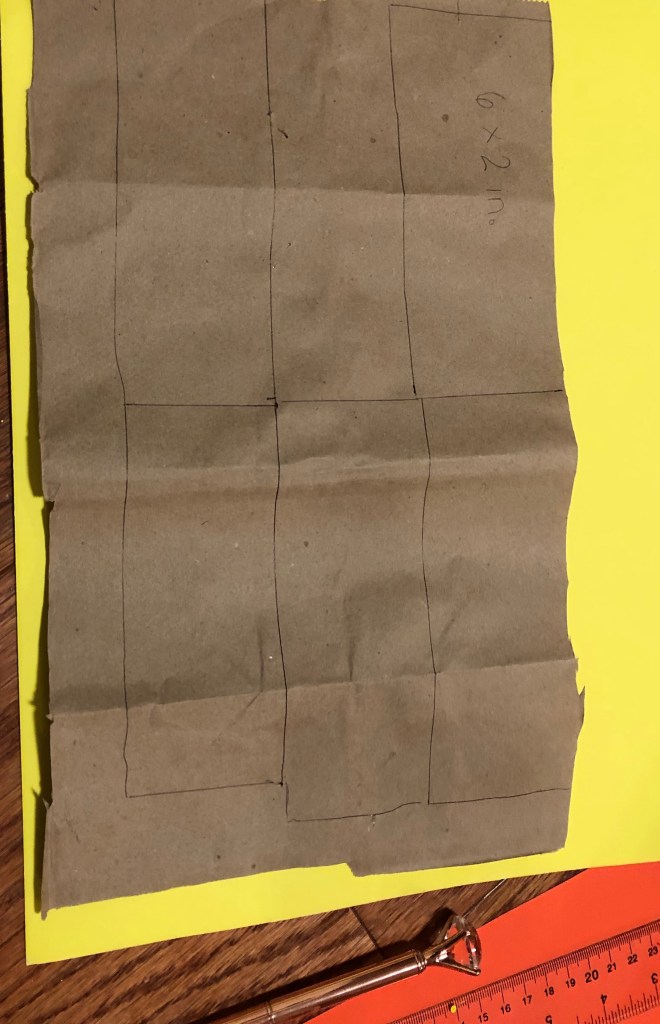 - Gather your pencil, scissors, and paper bag. Cut 6 x 2 inch rectangles from the paper bag.
