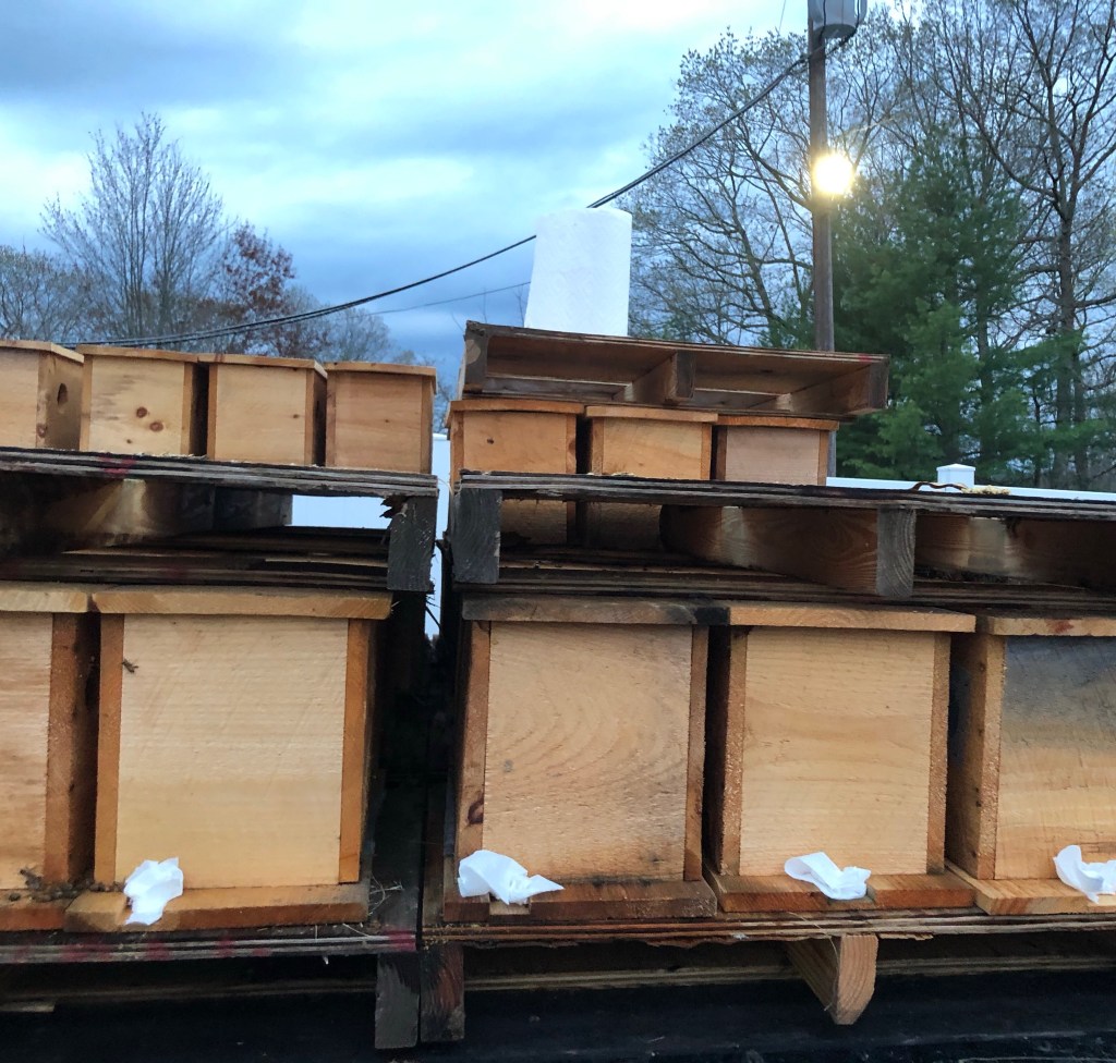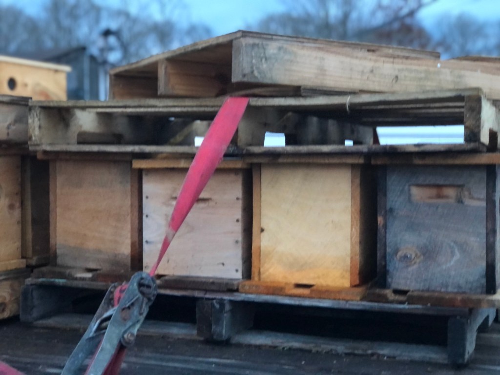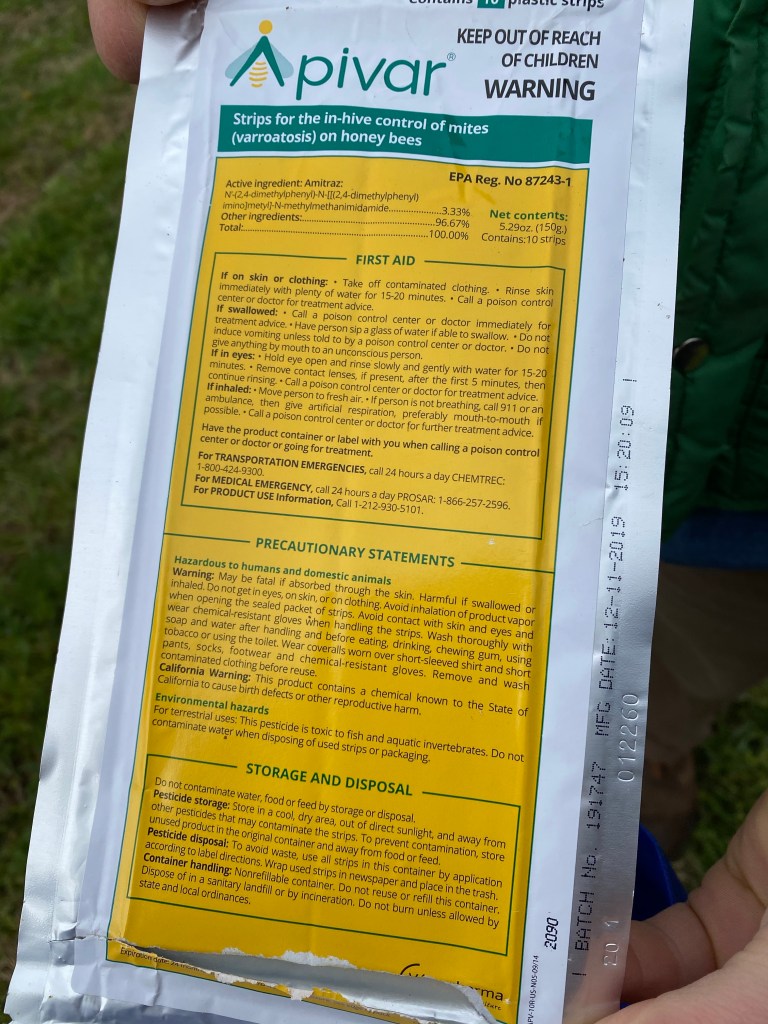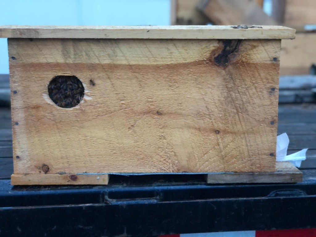 When I picked up the bees or a fully built colony package at my local bee association, they came in a big truck loaded with boxes of bees (above). A tissue was stuck to the entrance of the box to prevent the bees from swarming/flying.Just a couple of the bee boxes strapped on the truck.Look at those tissues- I couldn’t imagine it would hold the anxious bees from angrily swarming out.I purchased a starter bee kit from Amazon, including all the frames/foundation, the screened bottom board, outer cover with inner cover and deeps. Basically everything you need to start a colony. I painted each box with craft paint I found, and bought bee stencils online, then colored it with sharpie. I talked to several local experts, and they said even though the paints and sharpie weren’t ‘environmental’ friendly, through the weather, outdoors, and rain, the toxicity of it would ‘wear out’, being safe for the bees. In my area there were no environmental friendly paints or markers, so feel to take advantage of it if you have some locally.We first patted down and set a location, in the southeastern direction or a southern exposure to insure some sunlight for the bees. Be mindful that the location should have some floral and water sources nearby. We leveled the ground of the location to make sure the hive won’t fall down due to wind or nature. There were some cement blocks nearby, so we put the bottom board and 1st deep super for brood on it. We are also planning to set a ground cover under the blocks such as road cloth, weed barrier, grade gravel, or even wood chips ( this will help roundup vegetation near the hive). We only put 5 of the foundation frames in the deep ( 2 of them were frames filled with honey from another hive), since we will have to transfer the other 5 frames of bees (from the package) also into the deep. In total, we had 10 frames.We first unscrewed the top of the package. With a package, the bees are placed into the hive, from the package. Packages are better than Nucs because the workers and drones are already familiar with the queen so there is no “acclimation” process necessary. Also the colony has bees at all stages of life, from freshly laid eggs and on. Another advantage of the package is it comes complete with honey and pollen, which is important to the colony’s establishment as the colony is productive and can start foraging almost immediately.Some expert beekeeper friends of mine helped with the process. We started gently transferring each frame of the package into the box/deep with the hive tool, until it was filled. The bees were ‘hangry’, as the car ride was bumpy, they have been in the box for a few days now, and had low energy because of the weather. You can tell when a hive is queen-less or angry based on the ‘roaring’ sound it makes and how all the bees are frantically jumping onto you. We puffed the smoker a bit, but they were still grumpy.We didn’t check for a Queen bee, as we were just trying to transfer the colony as quickly as possibly before ‘any bee’ got hurt.The hive tool is the most essential beekeeping tool that you can use in any situation.We wanting to make sure the hive would ‘make it through’ and was fully stable, so we added a sugar water liter mixture or a hive top feeder. To use a hive top feeder, place it on top of the upper brood box, under the outer cover. An empty hive box is often placed around the feeder for added protection from the weather and robber bees. Because hive top feeders are protected from the sun you can add medication to the syrup if necessary. For the spring/late summer, an ideal recipe would be 2 cups of water and 1 pound of sugar.The bees were ALL over me! I was a little freaked out.We added Apivar strips to the deep by hanging each strip between 2 comb frames in the brood area or the bee cluster, with a minimum distance of 2 frames between strips. Then we suspended the Apivar strips in the brood chamber so bees can walk on both sides of the strips. It lasts for 50 days – until you should change it.We carefully brushed (with a brushed tool) all of the remaining bees from the package into the hive (and on ourselves), closing the top of the hive as best as we could.We added another cement block (you can add a rock) onto the top of the hive.So long bees… until 2-3 days for my first inspection!Everyday when I visit the hive, I log and track what I observed in a notebook. I suggest this for new beekeepers. Backyard Beekeeping has a great Beehive Inspection Checklist.