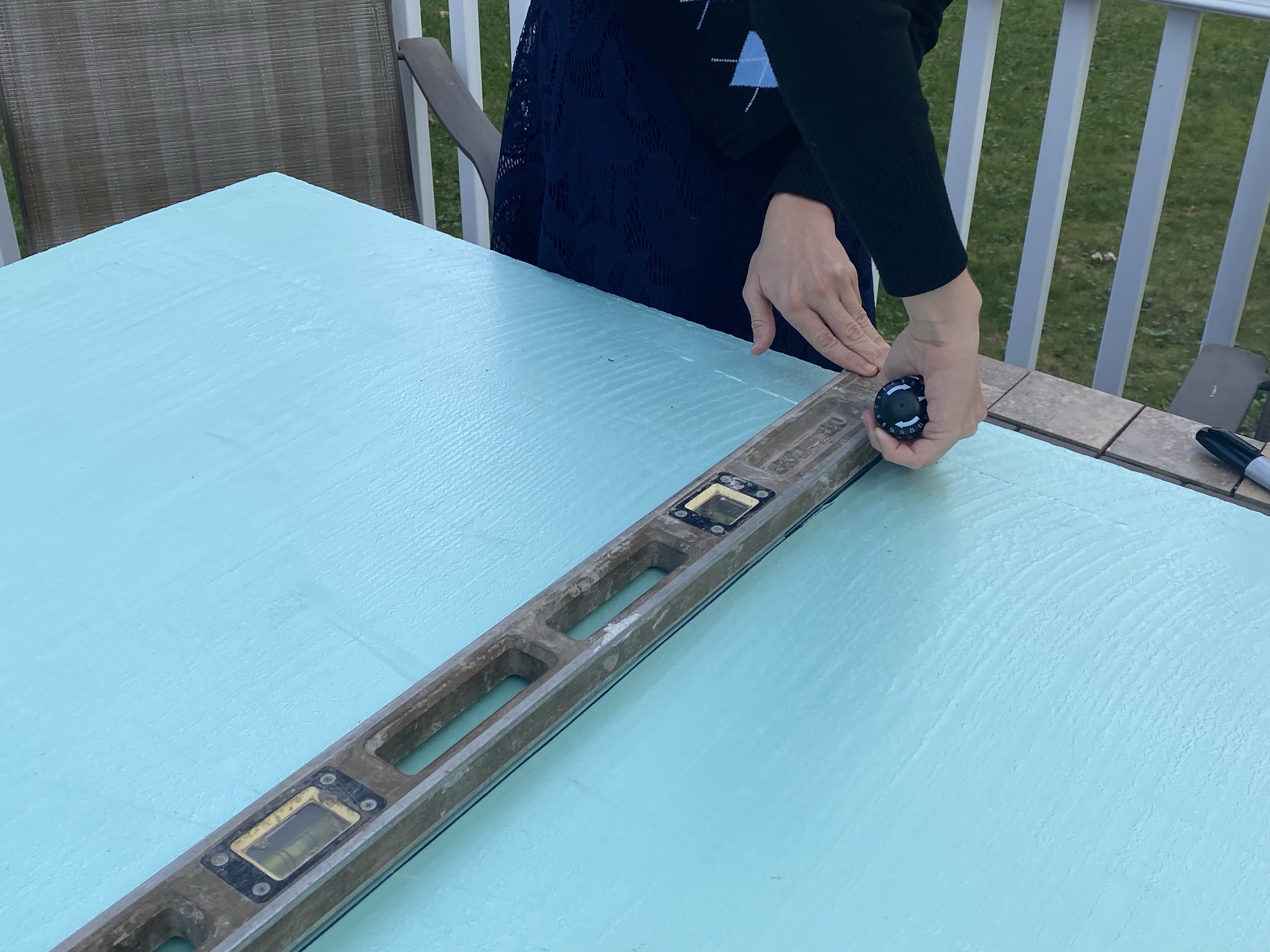 We measured our hive in inches at the site, so we marked our styrofoam with the same inches. Feel free to use whatever measurement suitable for you. We simply marked with a sharpie using our tape measure and cut the styrofoam area two times- to penetrate the styrofoam and then cut through the inch thick layer.